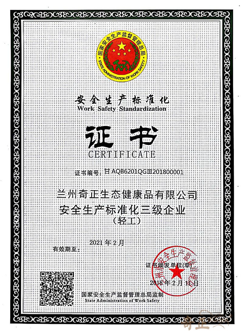安全生產(chǎn)標(biāo)準(zhǔn)化三級證書(2018.2)